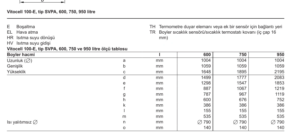 Teknik çizimle birlikte verilen ölçü tablosunda SVPA 950 litre için ek ölçüler de bulunur. Bu tabloda d ölçüsü 2083 mm, e ölçüsü 1853 mm, f ölçüsü 1219 mm, g ölçüsü 1119 mm, h ölçüsü 752 mm, k ölçüsü 386 mm, l ölçüsü 155 mm, m ölçüsü 535 mm, ısı yalıtımsız çap n ölçüsü Ø790 mm ve o ölçüsü 140 mm olarak verilir. Bu ölçüler, tesisat çıkış kotları ve bağlantı planlaması için oldukça yararlıdır.